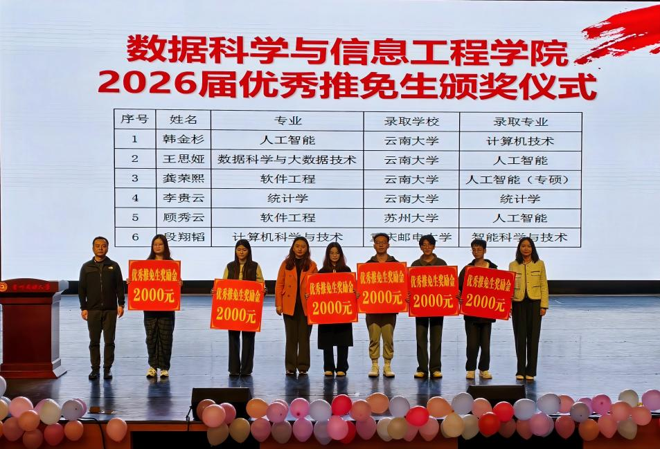 金风送爽,丹桂飘香,11月6日晚,贵州民族大学数据科学与信息工程学院“赋值霓裳·编码乡音——为青春赋新值,让传统焕新生”2025级迎新晚会在学校学生活动中心大礼堂隆重举行。晚会不仅以热烈氛围迎接2025级新同学,更特设优秀推免生表彰环节,为6名成功推免至知名高校的学子颁发“优秀推免生奖励金”,以榜样力量为新生启航赋能。