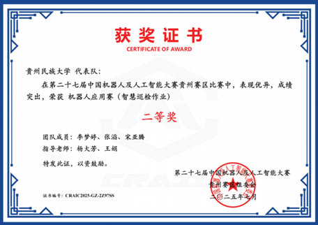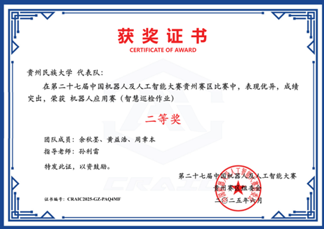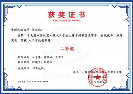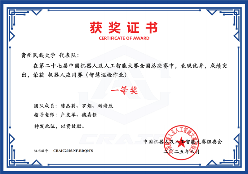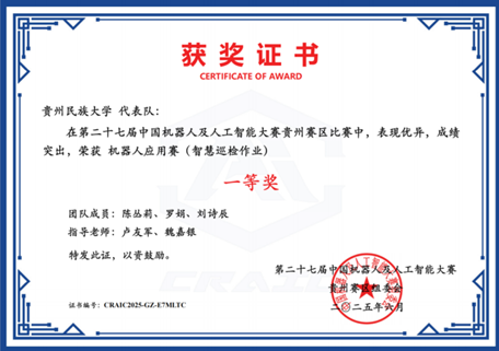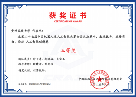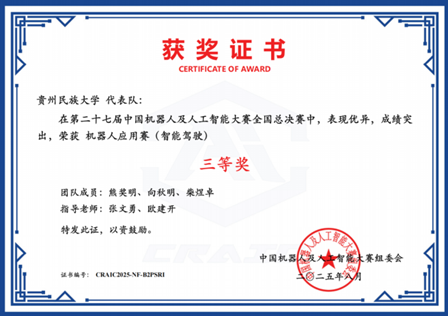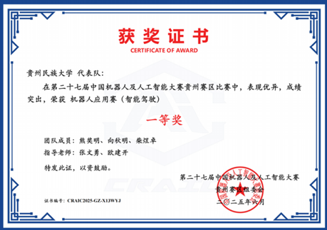 第二十七届中国机器人及人工智能大赛全国总决赛于本年度8月圆满结束,学院在本届赛事中收获颇丰。由研究生陈丛莉、刘诗辰、罗娟三位同学组成的团队,在卢友军和魏嘉银两位老师的悉心指导下,表现优秀,荣获国家级一等奖及省部级一等奖,充分彰显了贵州民族大学学子的创新意识与精神风貌。此外,在本次赛事中,学院还斩获国家级三等奖3项、优秀奖1项,以及省部级一等奖1项、二等奖3项、三等奖5项。